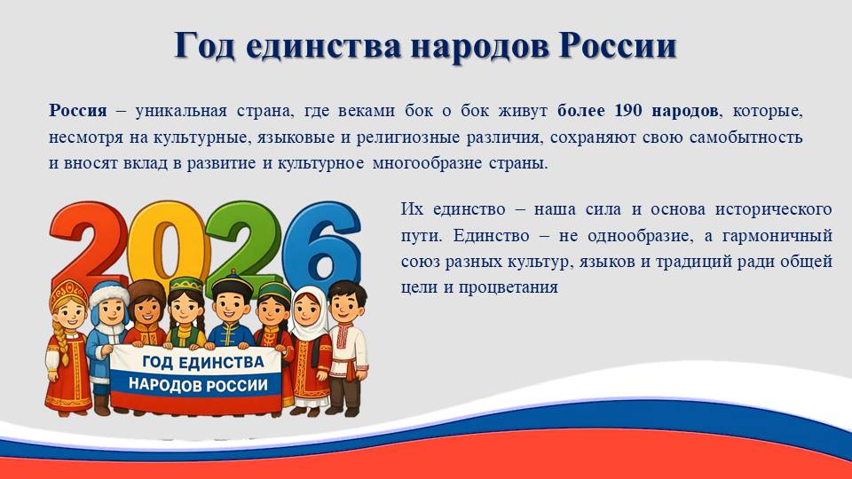 Россия - уникальная страна, где веками бок о бок живут более 190 народов, которые, несмотря на культурные, языковые и религиозные различия, сохраняют свою самобытность и вносят вклад в развитие и культурное многообразие страны. 2026 год Указом Президента Российской Федерации объявлен годом единства народов России - это не просто календарная дата. Это стратегическая веха, которая подчеркивает нашу общую историю, богатейшее культурное наследие и общее будущее.