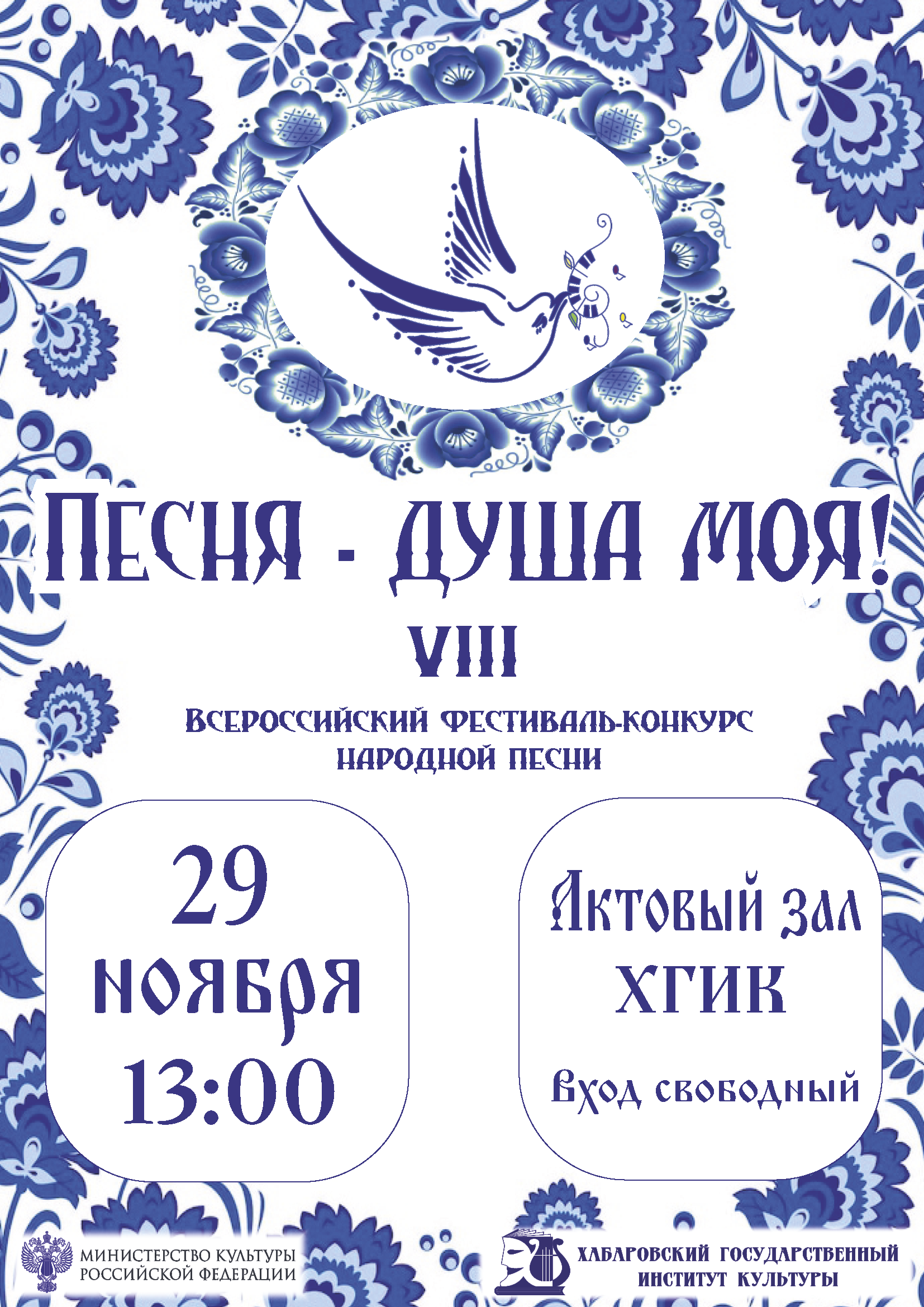 29-30 ноября 2025 года в Хабаровском государственном институте культуры состоится VIII Всероссийский фестиваль -конкурс исполнителей народной песни «Песня – душа моя!», посвященный 80-летию Победы в Великой Отечественной войне 1941-1945 г.