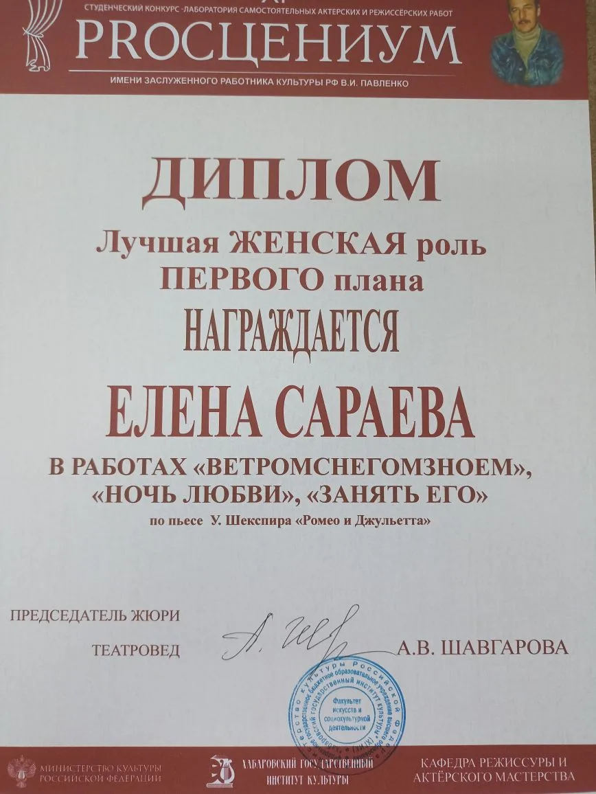 Лучшая женская роль первого плана - Елена Сараева, в работах «ВЕТРОМСНЕГОМЗНОЕМ», «НОЧЬ ЛЮБВИ », «ЗАНЯТЬ ЕГО» по пьесе У. Шекспира «Ромео и Джульетта»