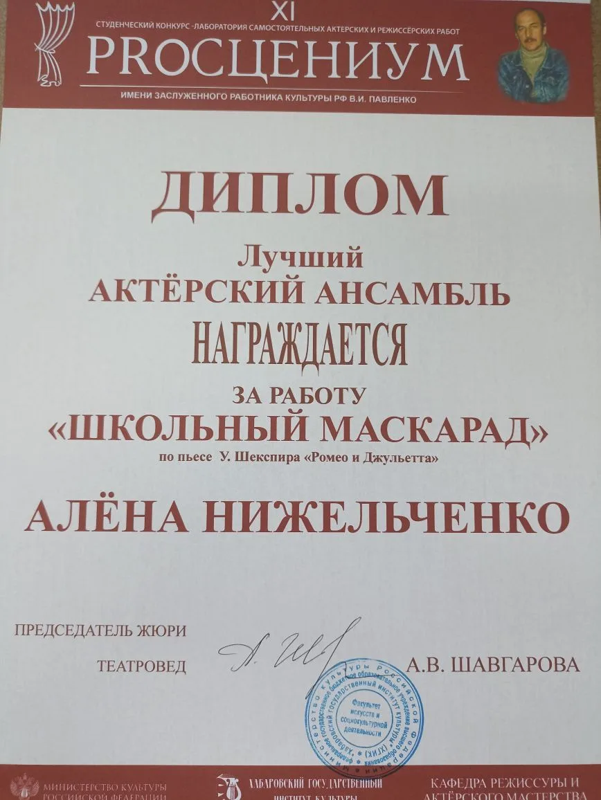 Лучший актерский ансамбль - Алена Нижельченко, за работу «ШКОЛЬНЫЙ МАСКАРАД» по пьесе У. Шекспира «Ромео и Джульетта»