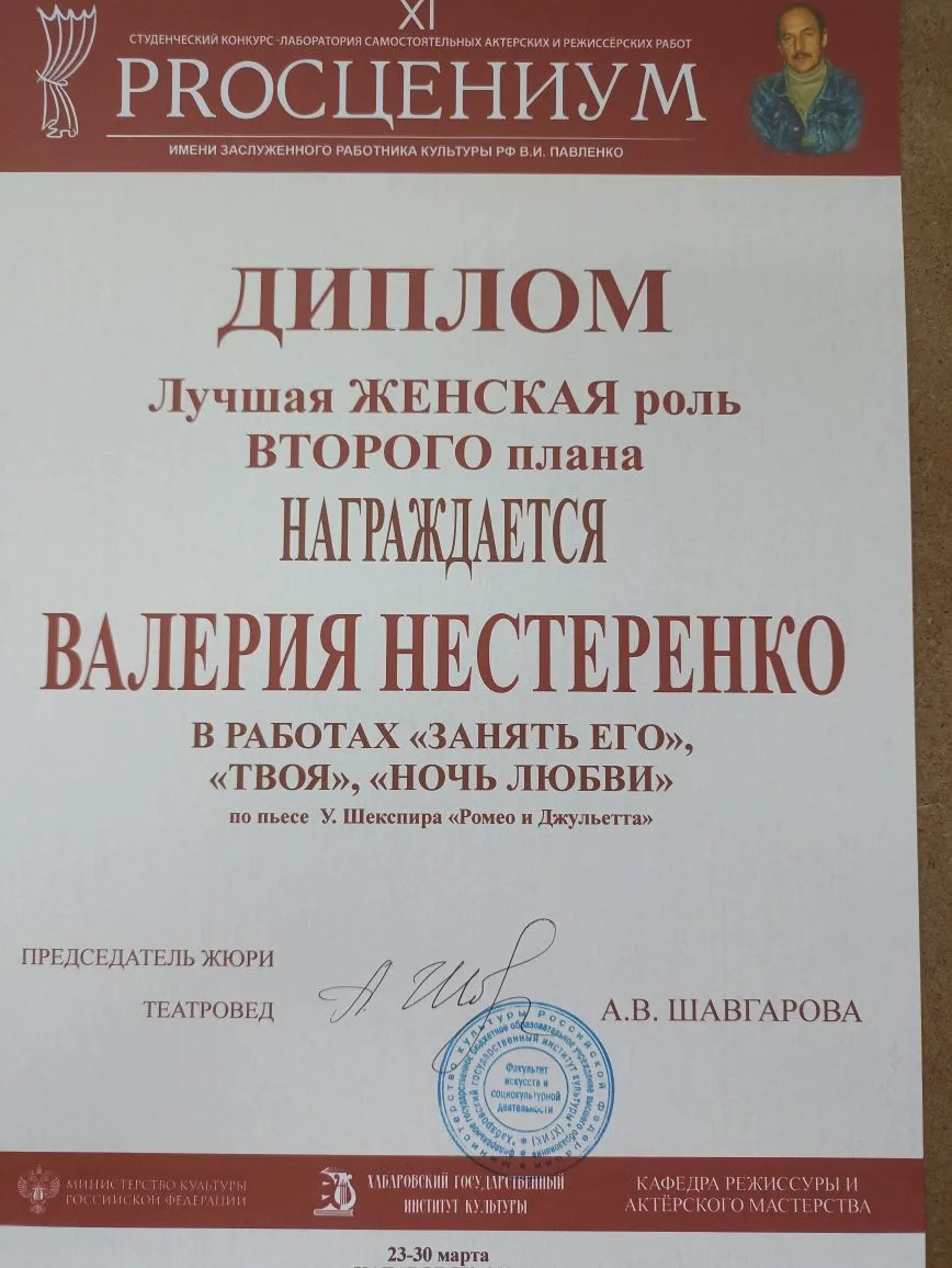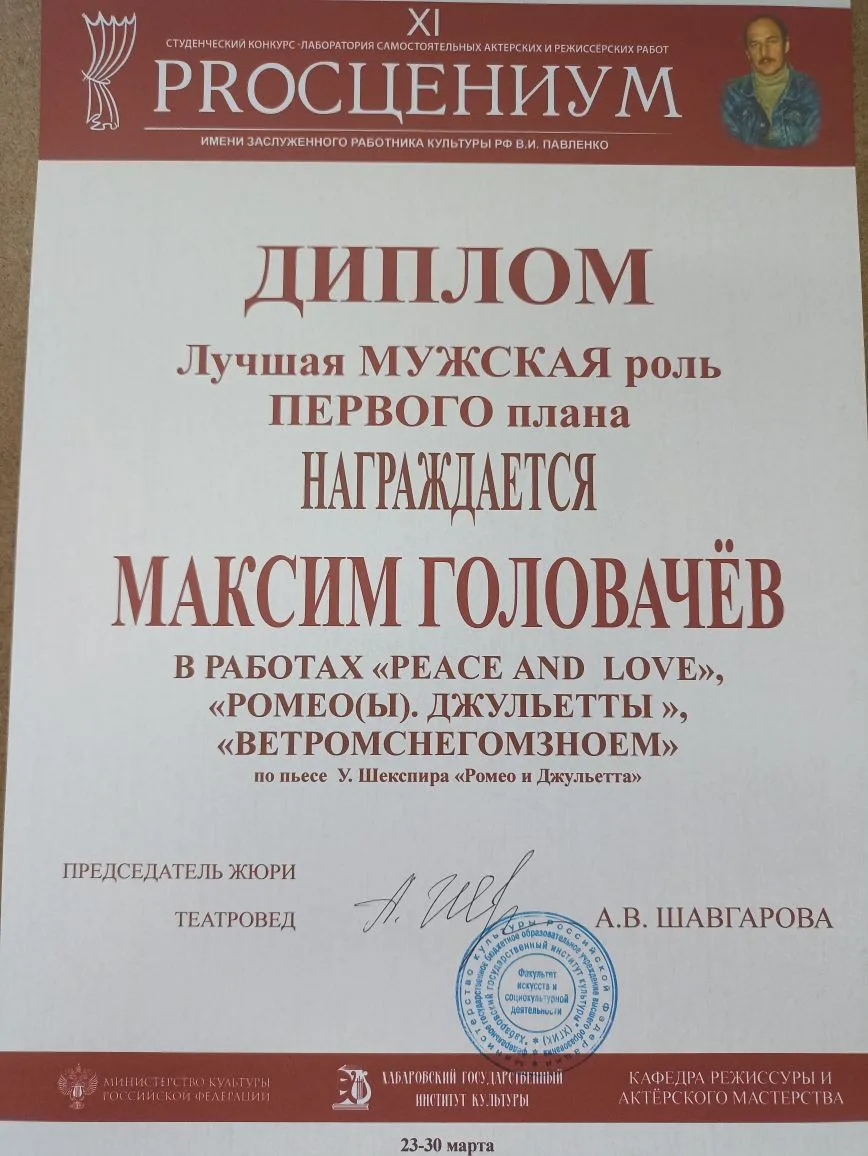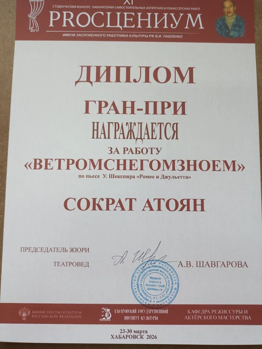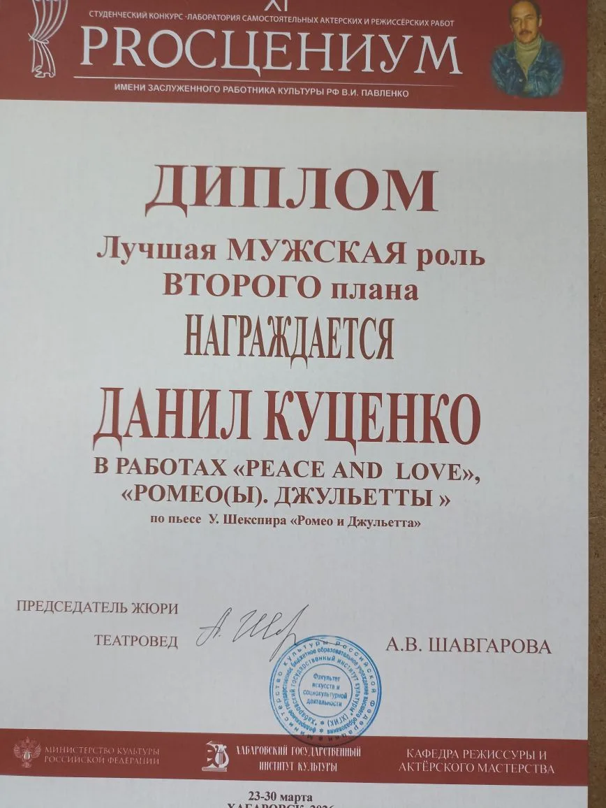С 23 по 29 марта 2026 года в Хабаровском государственном институте культуры состоялся ХI-й студенческий конкурс - лаборатория самостоятельных актёрских и режиссёрских работ «PROсцениум – 2026», имени заслуженного работника культуры Российской Федерации, профессора В.И. Павленко, посвященный Году единства народов России.