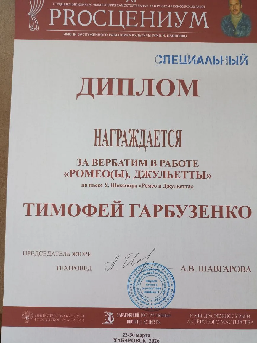 Спец диплом - Тимофей Гарбузенко, за вербатим в работе «РОМЕО(Ы). ДЖУЛЬЕТТЫ » по пьесе У. Шекспира «Ромео и Джульетта»