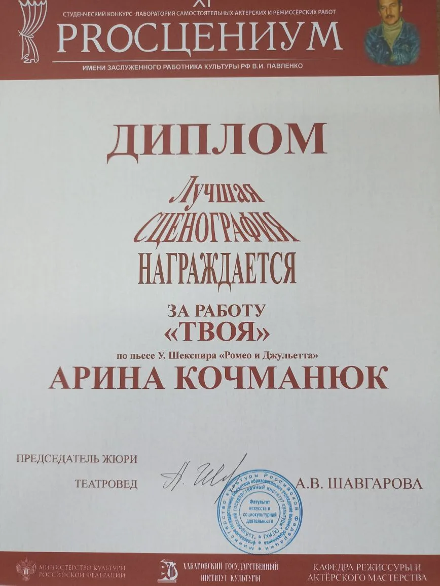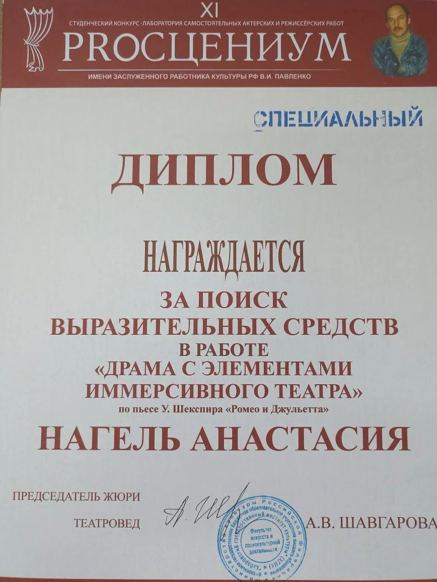 Спец диплом актерский дебют на сцене ХГИК - Полина Казурова, в работах «ЗАНЯТЬ ЕГО», «ШКОЛЬНЫЙ МАСКАРАД», «ТВОЯ», «НОЧЬ ЛЮБВИ » по пьесе У. Шекспира «Ромео и Джульетта»