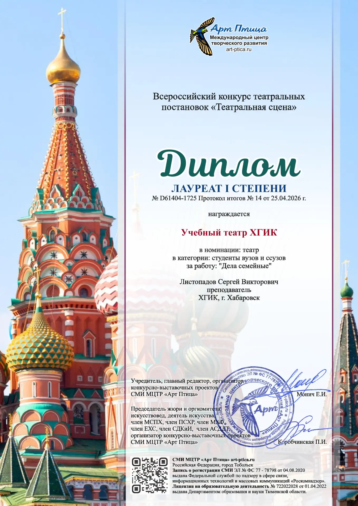 Поздравляем Сергея Викторовича Листопадова, Татьяну Павловну Листопадову и всю труппу учебного театра с наградами Всероссийского конкурса театральных постановок «Театральная сцена» (номинация «Театр»).