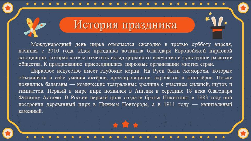 18 апреля весь мир отмечает удивительный и яркий праздник - Международный день цирка. Это день, когда мы вспоминаем о смелых акробатах, грациозных гимнастах, остроумных клоунах и, конечно, о тех удивительных животных, которые дарят нам радость и восхищение.