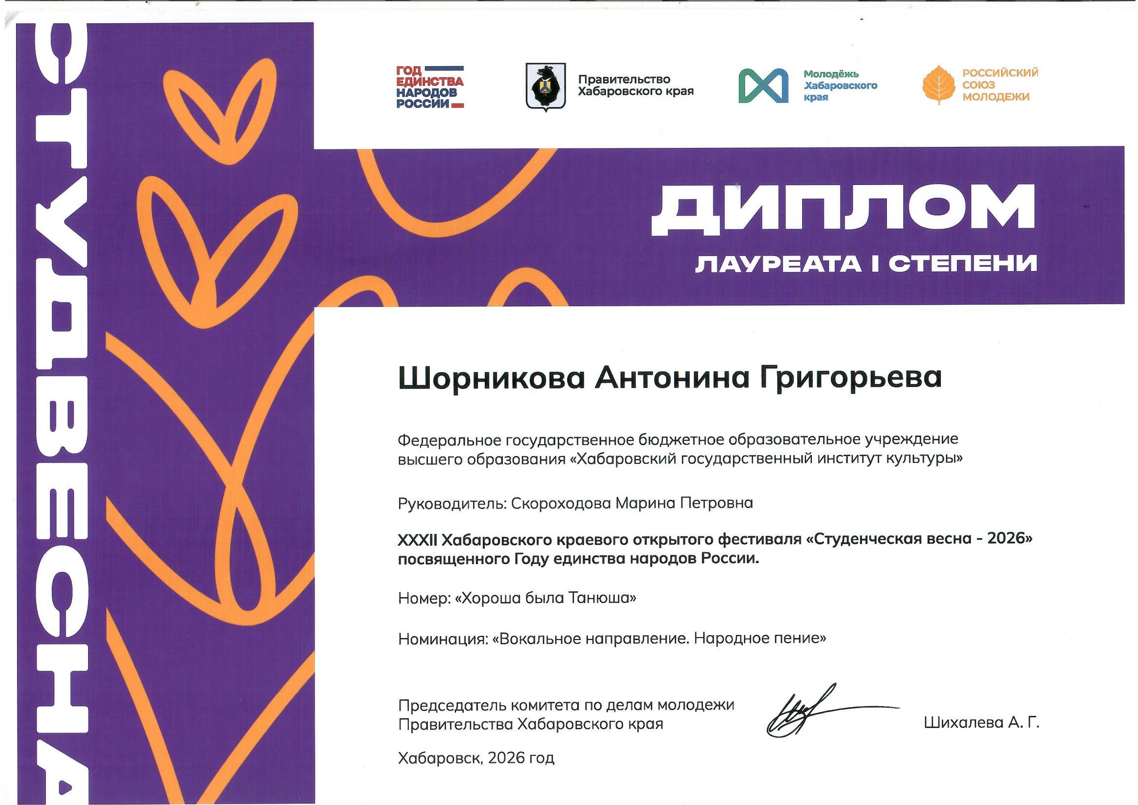 🏆 Шорникова Антонина Григорьевна, студентка 4 курса — лауреат I степени