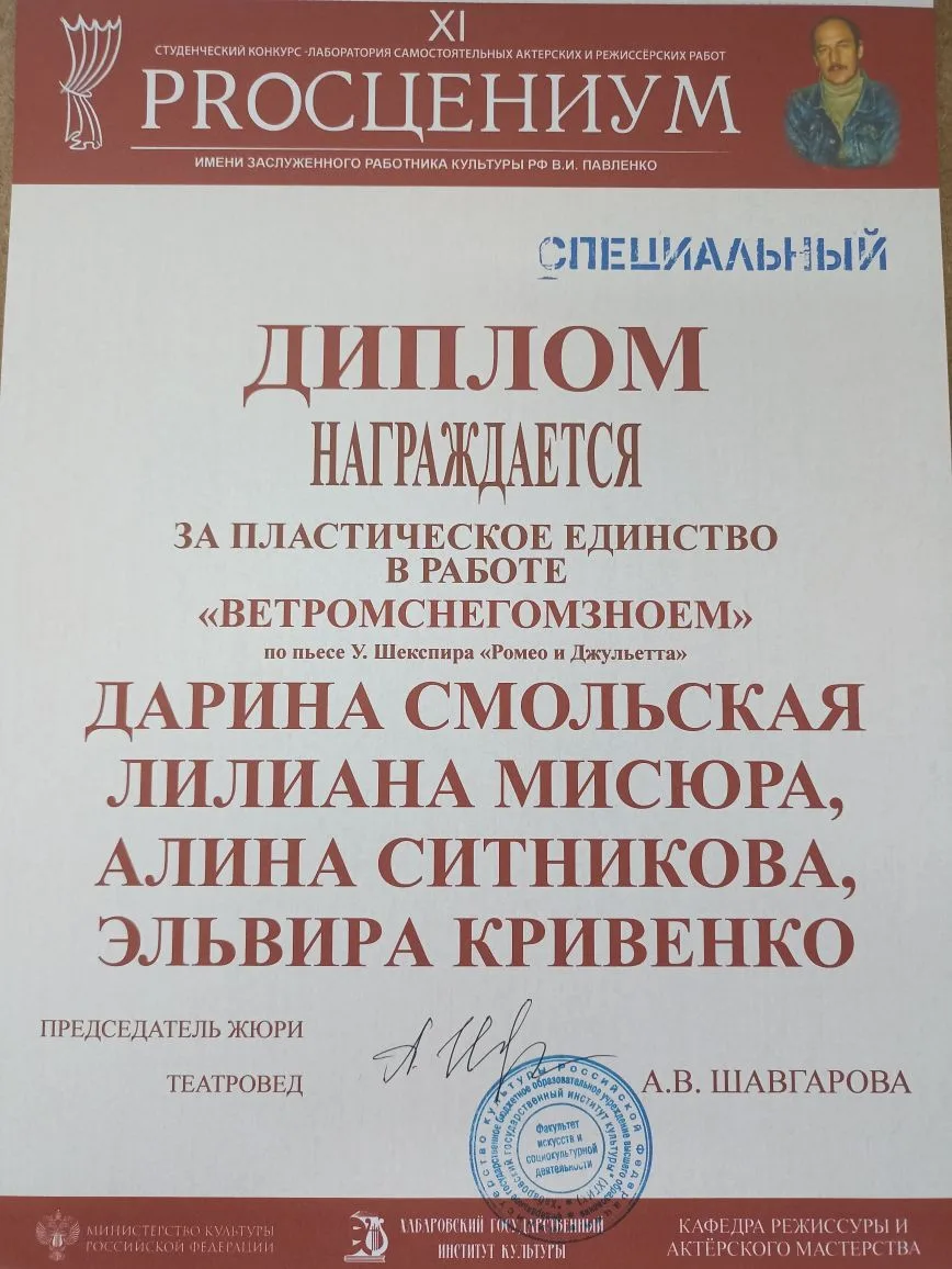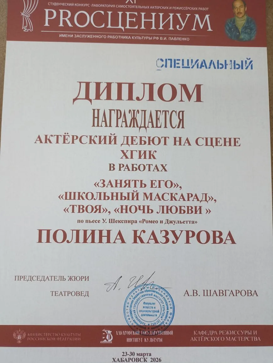 Спец диплом актерский дебют на сцене ХГИК - Полина Казурова, в работах «ЗАНЯТЬ ЕГО», «ШКОЛЬНЫЙ МАСКАРАД», «ТВОЯ», «НОЧЬ ЛЮБВИ » по пьесе У. Шекспира «Ромео и Джульетта»