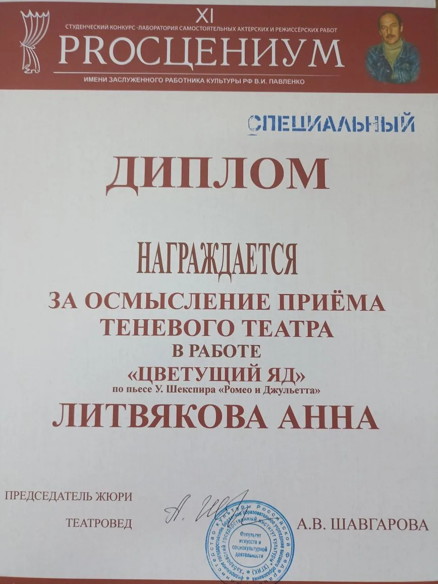 Спец диплом за осмысление приема теневого театра - Литвякова Анна, в работе «ЦВЕТУЩИЙ ЯД» по пьесе У. Шекспира «Ромео и Джульетта»