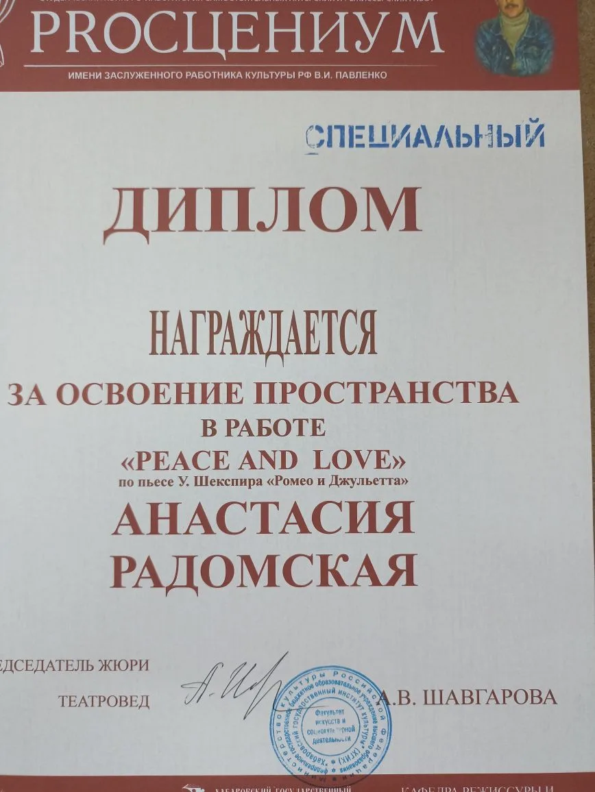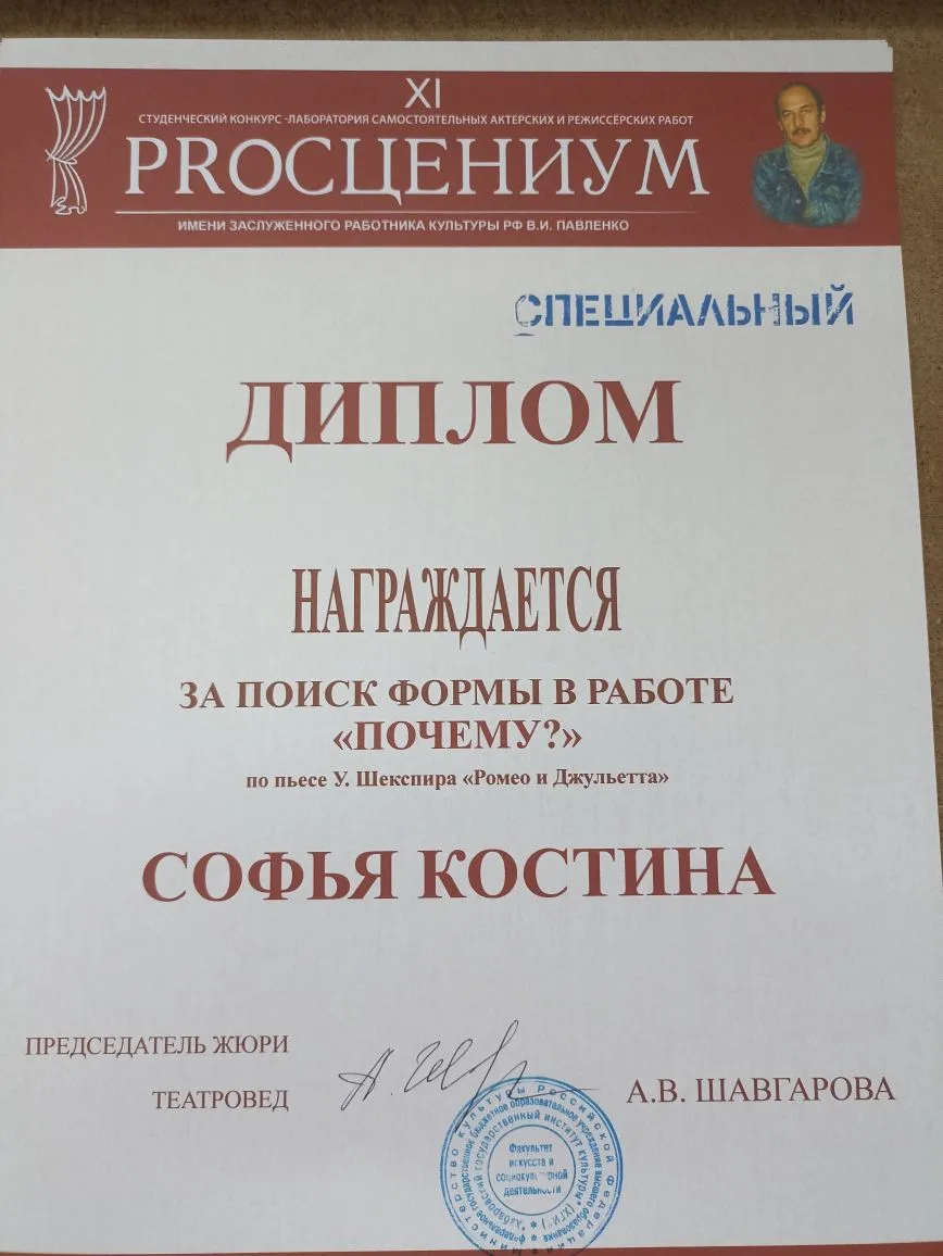 Спец диплом - Софья Костина, за поиск формы в работе «ПОЧЕМУ?» по пьесе У. Шекспира «Ромео и Джульетта»