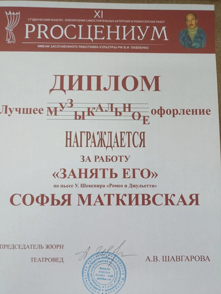 Спец диплом - Тимофей Гарбузенко, за вербатим в работе «РОМЕО(Ы). ДЖУЛЬЕТТЫ » по пьесе У. Шекспира «Ромео и Джульетта»