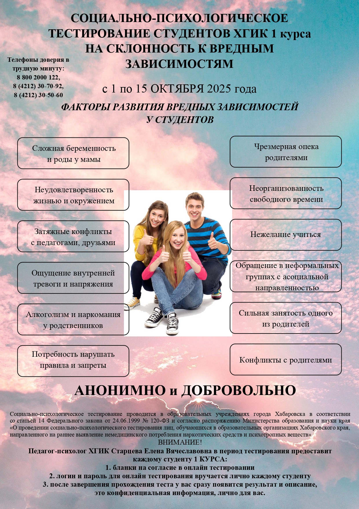 Согласно законодательству РФ и распоряжению Министерства образования и науки Хабаровского края тестирование на склонность к зависимостям разного рода в Хабаровске проходит в школах, ССУЗах и всех ВУЗах в период